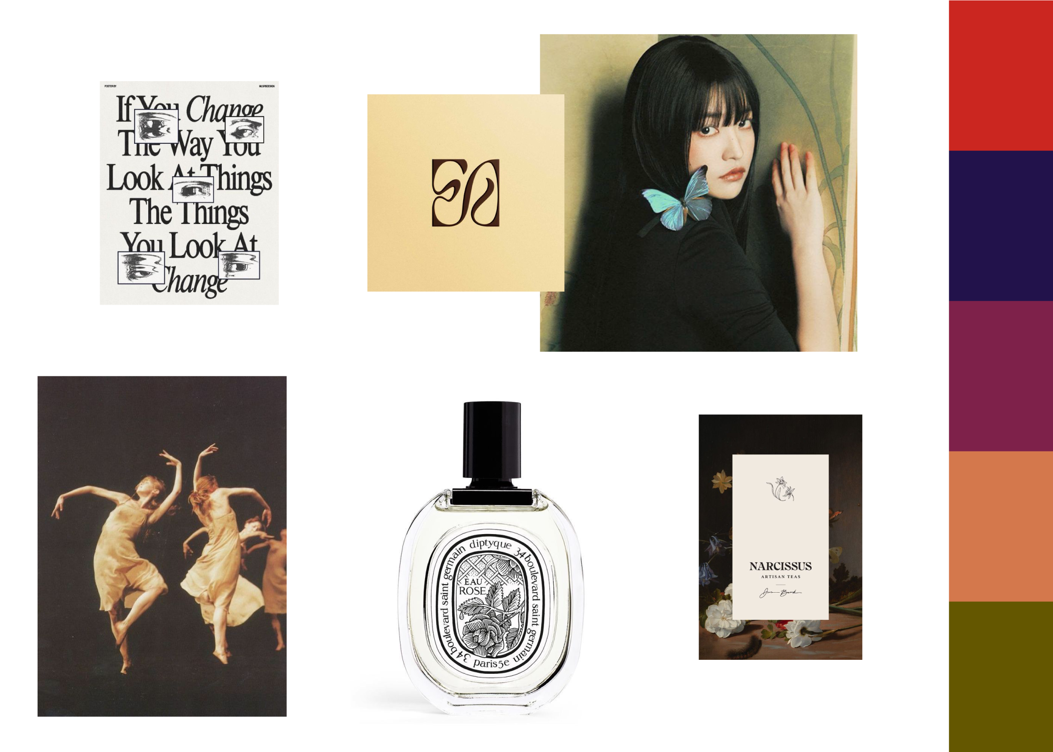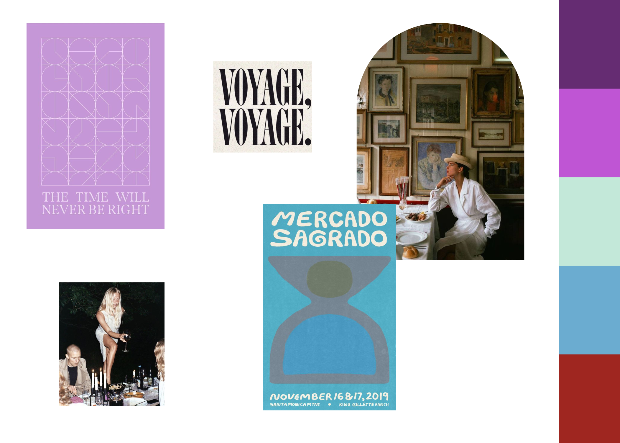 Blues, creams, blushes, pearlescent, ocean themes, soft serif typography, collages, and vintage-like photo effects (adding grain, using film photography)—comforting and nostalgic visuals.