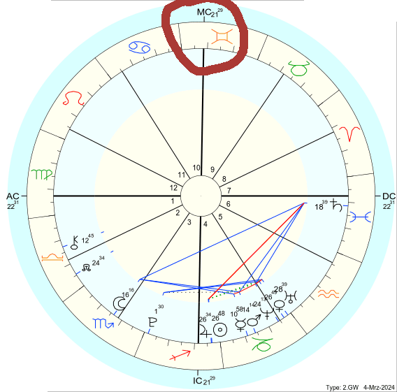 Let’s take my chart as an example (above). My Midheaven (MC) is in Gemini, and its ruling planet, Mercury, is positioned at the bottom of my chart (circled).